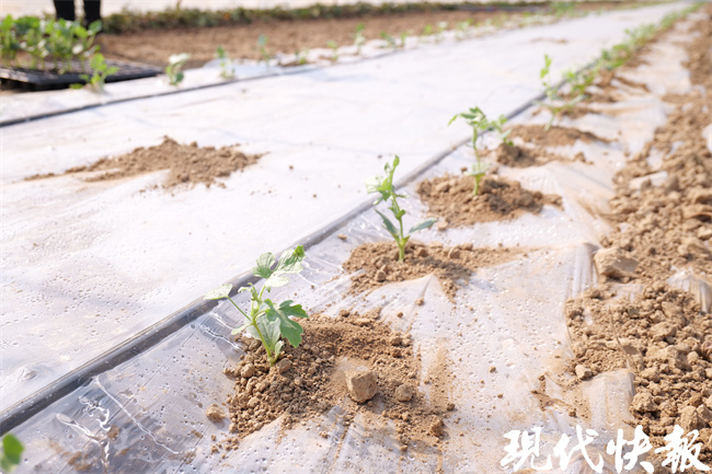 记者看到,大棚里一棵棵绿意盎然的瓜苗整齐排列,覆在地上的薄膜在阳光的照射下闪闪发光。种植户王小保与妻子穿着单衣,正在忙着下苗。